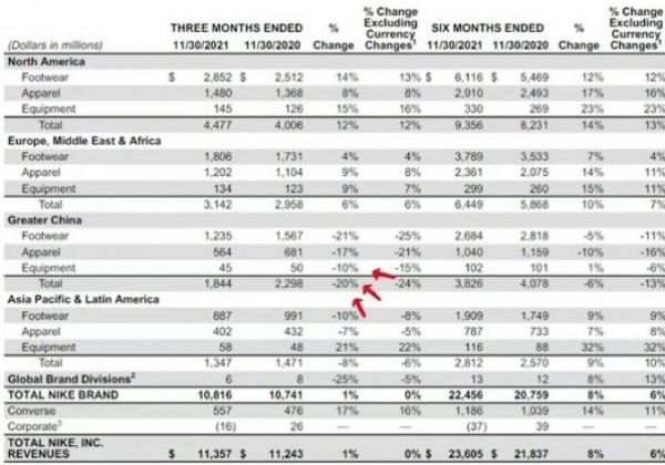耐克在中国的业绩还受到了生产端的影响。2022财年二季度(截至2021年11月30日的三个月)财报显示,由于疫情造成越南工厂关闭,大中华区营收同比下降了20%。