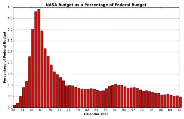 阿波罗计划时期,NASA连续4年耗费美国财政预算的3%,最高接近5%。