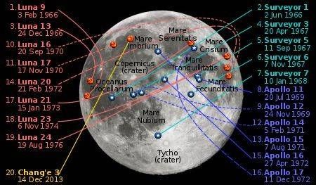 月球正面的软着陆探测器分布地图,图中Luna为苏联的月球系列,Surveyor为美国的勘探者系列,Apollo是阿波罗系列,另有嫦娥三号 | Wikipedia