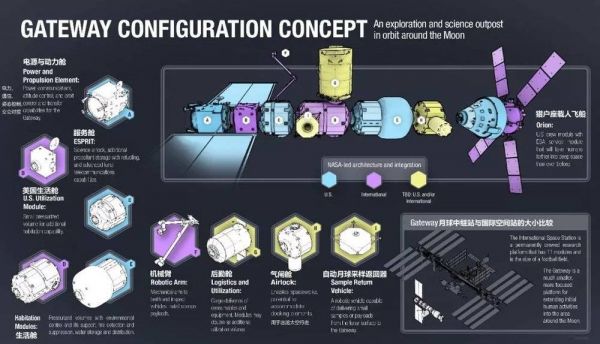 Gateway的构造概念图,右下角是国际空间站和Gateway的大小比较 | NASA,作者汉化
