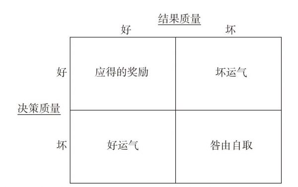由于运气的介入,你做出的决策(有可能造成多种结果)才会产生实际结果。以决策质量和结果进行组合,可以得到四种结果:好决策+好结果,是应得的;好决策+坏结果,是坏运气;坏决策+好结果,是狗屎运;坏决策+坏结果,是咎由自取。