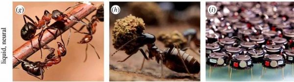 液体大脑由有神经系统或神经样组分的组分形成,例如(g)蚂蚁或(h)白蚁的蚁群及其在机器人领域的人工对应物(i)。在这些液体大脑中,每个成分都有自己的固体大脑。