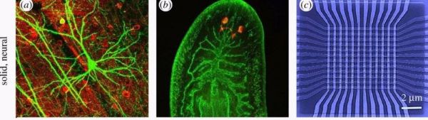 标准神经元网络(a)涉及通过分化后的,位置固定的神经细胞突触权重连接而定。较简单的生物,如涡虫(b)扁虫含有不同于图(a)中较复杂脑的神经结构。