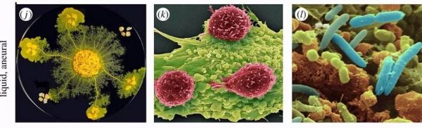 第二类主要的液体脑包括缺乏内部大脑的运动个体,例如(j)黏菌(Physarum),(k)免疫网络和(l)微生物群落。