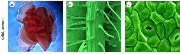 原生动物(Placozoans)(d)完全缺乏神经元并且具有非常简单的解剖复杂性,但表现出活跃的行为。结构不同的植物也缺乏神经元,但它们的一些模块化部分,包括根(e)和叶子中的气孔(f)都具有一定自动能力,属于“固体”子类。