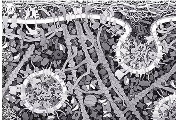 最后,单细胞包含多种信息处理现象,包括复杂的阶梯级联,遗传-代谢相互作用和泡状结构相关的计算,例如(d)中显示的用于储存胰岛素的机器。