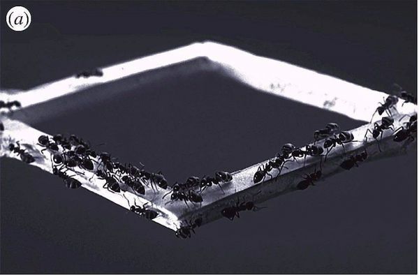 蚁群(a,由Guy Therauiaz提供)寻找最优路径的过程可以理解为最少作用量问题(least-action problem),其中通过优先选择具有最高信息素浓度的路径来发现最短路径。