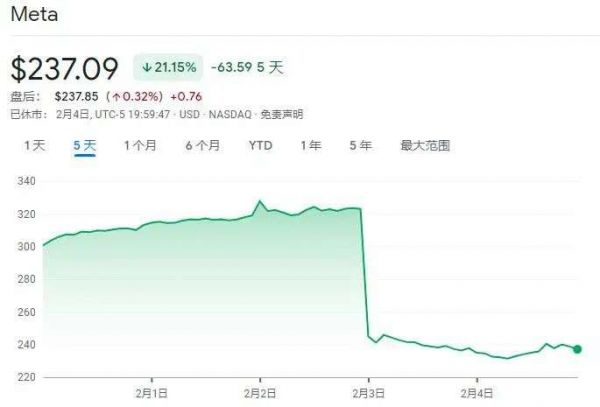 不过市场信心并不单从一个圣诞季就能提高。2 月 4 日,Facebook 更名 Meta 后的首份财报发布后,股价暴跌超过 26%,市值一天蒸发 2400 亿美元(超过 15 万亿人民币),创下了美国上市公司最大跌幅纪录。