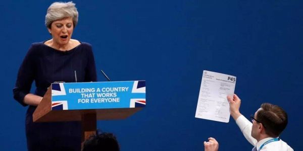 梅原本可以在当年十月保守党大会的演讲上扳回一城,但运气却不站在她这边。在那次戏剧性的大会上,一位喜剧演员冲到台前,抖抖晃晃地递给梅一张伪造的P45离职表单,随后转过身向外交大臣鲍里斯·约翰逊竖起大拇指,高声说道: