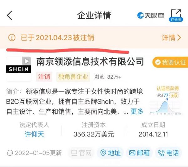 天眼查数据显示,曾是「SHEIN」国内主体公司的“南京领添信息技术有限公司”已于去年4月23日注销营业执照。进一步穿透其股权结构,许仰天本人也不再担任国内任何公司的法人。所以基于多方信息来看,不排除「SHEIN」要将公司核心力量乃至总部迁移到新加坡的可能。