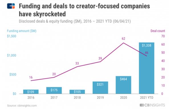 图示:面向以创作者为中心的公司的融资和交易急剧增加(图源:CBInsights)