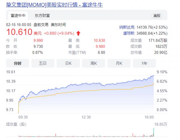 2014年12月,陌陌在美国纳斯达克交易所敲钟上市,发行价为13.5美元,发行首日报收17.02美元,涨超26%。2018年最高涨至48.766美元,较发行价上涨261%。
