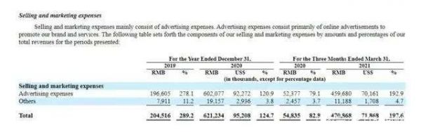 2019年和2020年,Soul广告费用分别为1.966亿元和人民币6.02亿元,分别占其总营收的278.1%和120.9%。2021年前三个月,Soul广告费用4.597亿元,同比增长784.04%,占其当期总营收的192.9%。