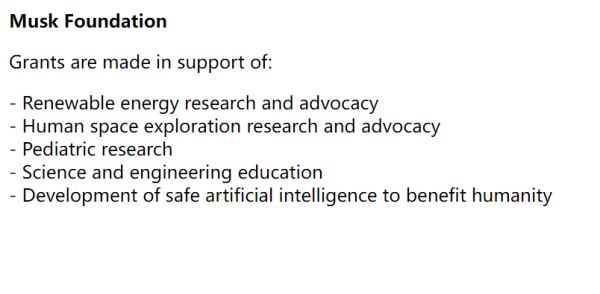 2012年,该基金向加州大学洛杉矶分校(UCLA)的神经外科研究人员捐赠了8750美元,此时马斯克的 Neuralink 公司正在启动脑机接口研究项目。