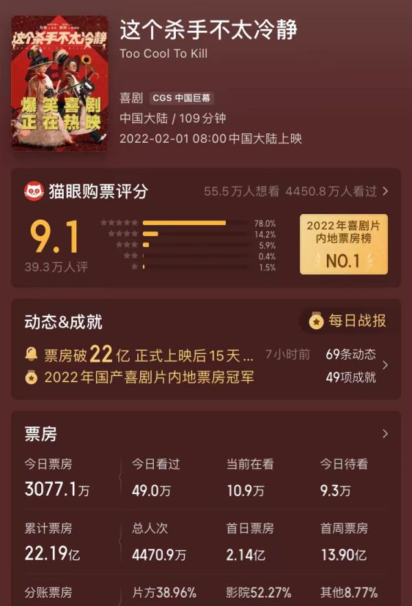《这个杀手》是开心麻花久违的成功案例,也是三驾马车在电影市场上的“翻身仗”之一。 虽然官方并未对外透露《这个杀手》的成本如何,但是目前电影片方分账票房达到7.88亿元,显然是春节档投入产出回报最高的电影。