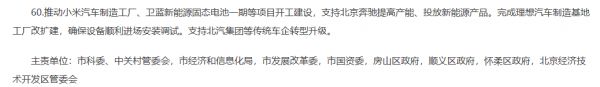 在北京市《2022年市政府工作报告重点任务清单》的通知中,第60条显示,推动小米汽车制造工厂、卫蓝新能源固态电池一期等项目开工建设,支持北京奔驰提高产能、投放新能源产品。完成理想汽车制造基地工厂改扩建,确保设备顺利进场安装调试。支持北汽集团等传统车企转型升级。