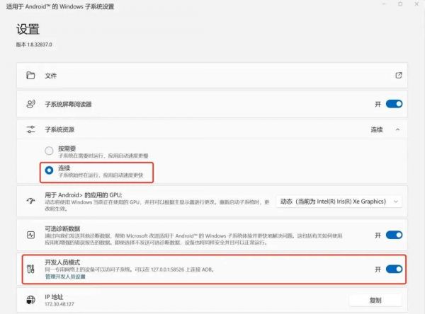 在子系统设置界面中,开启连续和开发者模式功能,就可以进行下一步了。