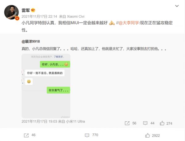 只是金凡在某种程度上,也做到了“在其位谋其政,任其职尽其责”。在MIUI12系统被口诛笔伐最惨烈的2021年,雷军曾发微博表示,小凡同学特别认真,我相信MIUI一定会越来越好。