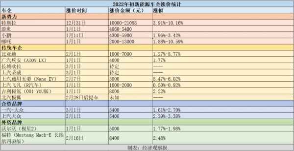 据经济观察报记者不完全统计,从2021年年末至2022年2月15日的两个半月中,宣布旗下新能源车型涨价的车企共有16家,其中包括特斯拉、蔚来、小鹏、哪吒4家造车新势力,比亚迪、广汽埃安、上汽荣威等7家传统车企,以及一汽-大众、上汽大众2家合资品牌与沃尔沃、福特2家外资品牌。各家车型上涨价格位于1000到21088元不等,主要集中在3000至6000元之间。