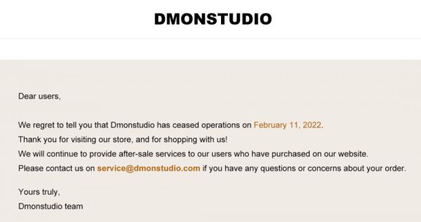 近日,Dmonstudio在官网发布公告称网站运营于2月11日起关停,团队会继续为已购物消费者提供售后服务,对订单有疑问的用户可通过官方邮箱联系团队。