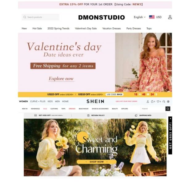 从关停之前的网站页面风格和布局来看,Dmonstudio对标SHEIN的倾向很明显,在品类上也与SHEIN主打的时尚女装高度重合,只是在产品价位上略高于SHEIN,大多数定价超过30美元。