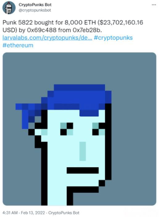 2022年2月13日,CryptoPunks发行了三年多的万副作品之一、编号#5822 以8000ETH(以太币)的价格售出,约2370万美元。次日,区块链技术公司Chain 首席执行官 Deepak Thapliyal 在社交媒体上宣布自己为 CryptoPunk #5822的买家。