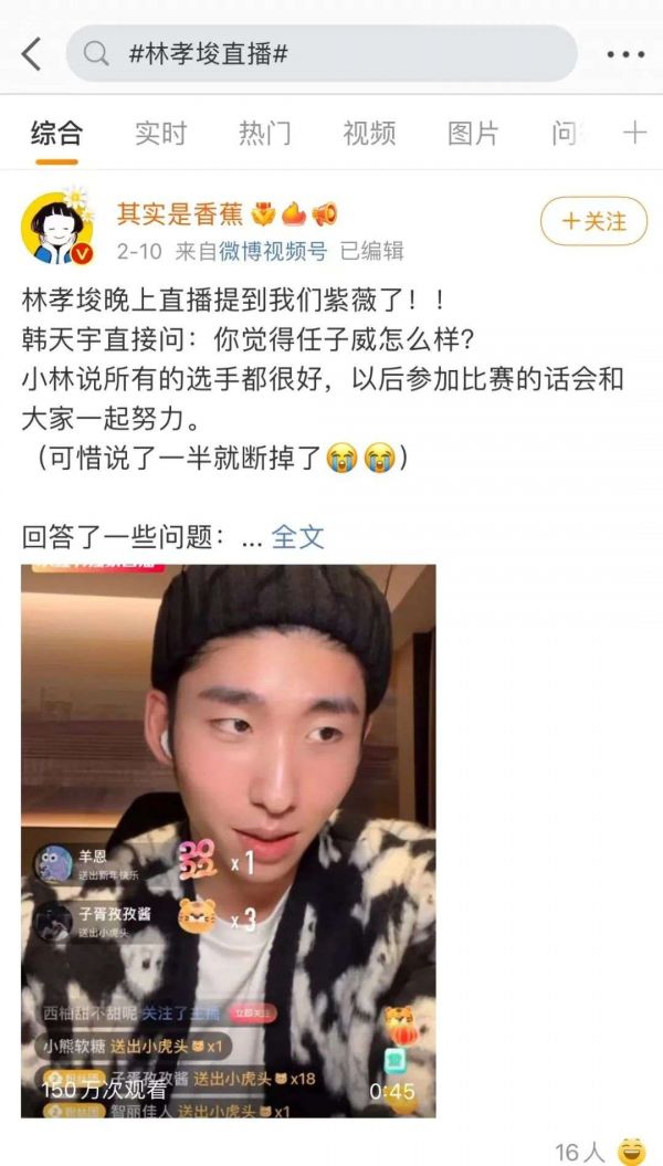 当晚,欧乐守在手机前,一步不动看完了整场直播。同时,看着#林孝埈直播#话题登上热搜第一位时,欧乐在微博上编辑了数条直播片段,想要努力“蹭”上直播热度。