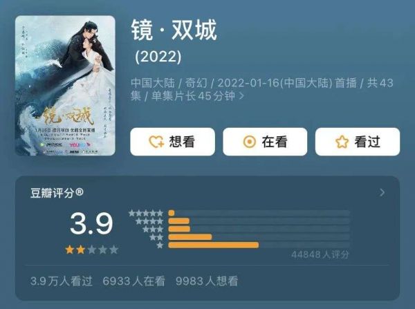 口碑方面,《镜·双城》只获得4万+人打出的3.9豆瓣评分,在知乎的知友推荐也不过61%,且推荐人数不足千人。