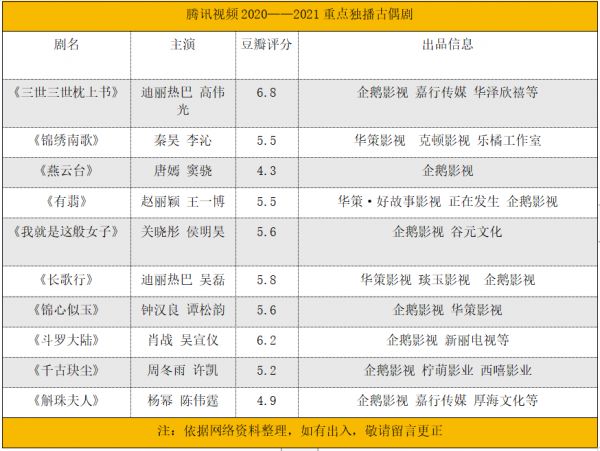 结合上文表格与腾讯视频近些年播出的重点古偶剧看,华策影视、新丽电视、柠萌影业、 嘉行传媒是其较为青睐的四家影视公司,在2020—2021重点独播的10部古偶剧的出品信息栏中更有4部出现了华策影视的身影。