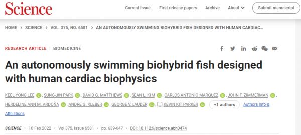并且,这项研究还刊登在Science上,论文题目叫「自主游泳的生物杂交鱼设计与人类心脏生物物理学」(An autonomously swimming biohybrid fish designed with human cardiac biophysics)。