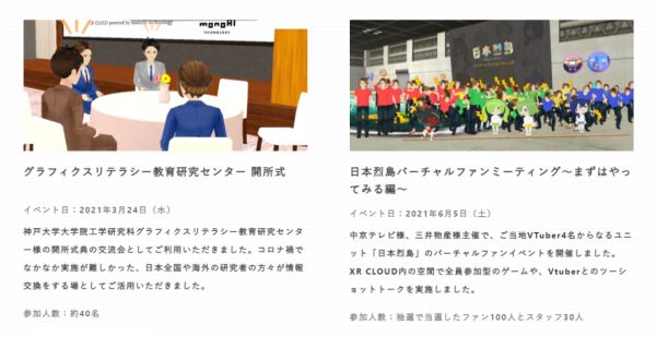 2021年,XR CLOUD分别承办两场虚拟空间活动,分别为神户大学图形素养教育和研究中心开幕式,和vTuber组合“日本烈岛”的粉丝见面会。