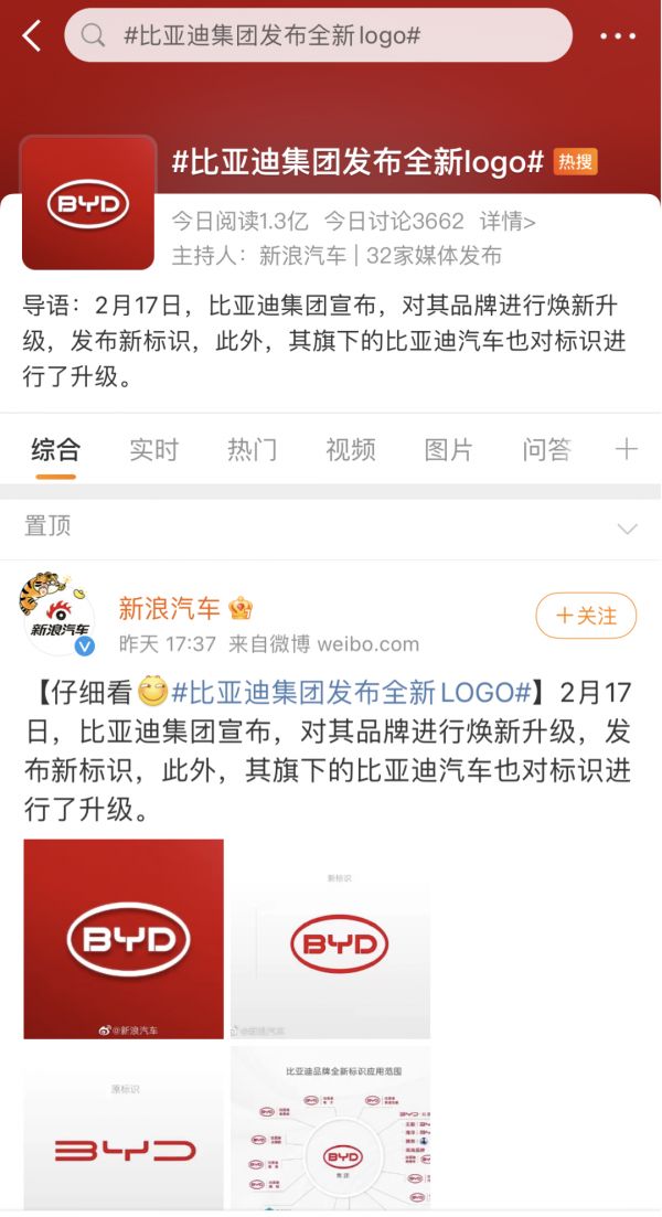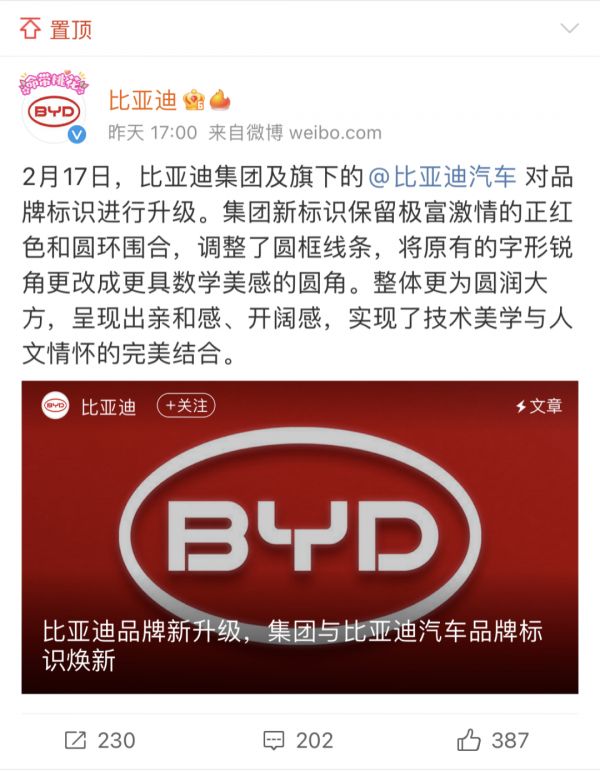 2022年2月17日晚间,比亚迪集团在微博平台上宣布,对其品牌进行焕新升级,发布新标识。此外,其旗下的比亚迪汽车标识也进行了升级。2月18日,一则“比亚迪集团发布新logo”的词条,一度冲上微博热搜榜。