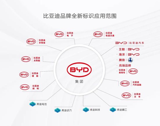 据悉,比亚迪集团新标识,将在旗下电子、新能源、轨道交通以及汽车产业中使用,与此同时,汽车产业的乘用车板块各品牌将使用各自的品牌标识。