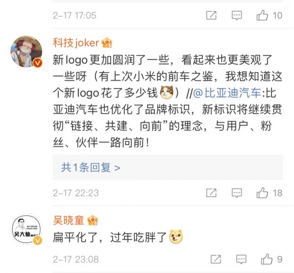 有网友看到#比亚迪集团发布全新logo#这个消息,心头还挺激动的,意味真的是全新的logo,但是打开一看,完全出乎他的意料,他表示:“还是和原来一样“丑”,坚持企业想法没问题,但是不是也可以适当考虑下广大消费者诉求,关于汽车logo这事,我记得不是一次两次被网友讨论了。按照我的ps、ai经验,设计师至少花了三分钟改吧。”