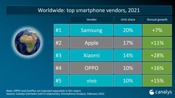 这几年,小米在海外市场高歌猛进,撑起了其手机业务的大半壁江山。Canalys最新数据显示,小米以1.91亿部的出货量位列全球第三,市占率达14%,仅次于三星和苹果,据IDC统计,2021年小米海外市场的销量占其总销量的73.2%,而在2019年,小米的全球市场份额仅为8%,与OPPO、vivo的市占率相同。