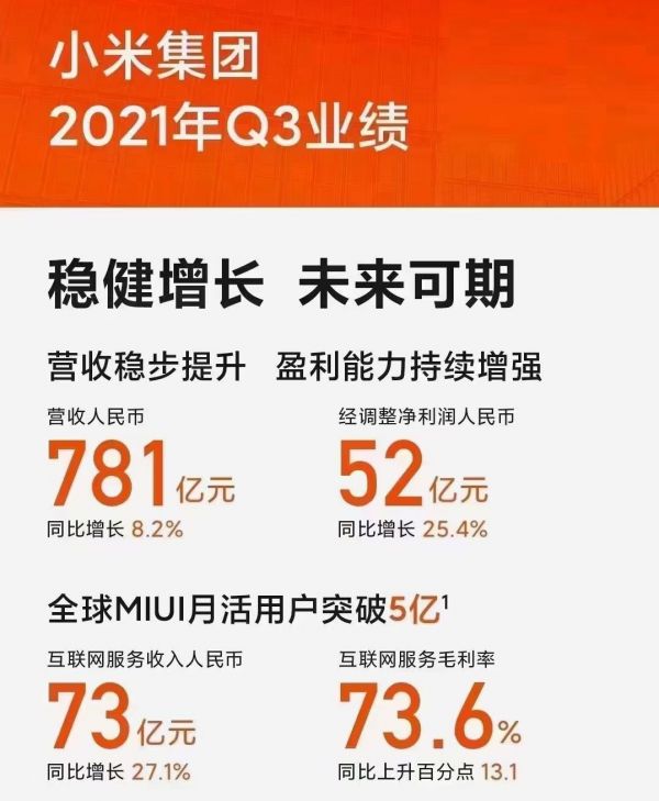 以小米发布的Q3财报数据来看,营收和利润的整体情况较好。21年Q3,小米营收781亿元,同比增长8.2%;经调整净利润52亿元,同比增长25.4%。