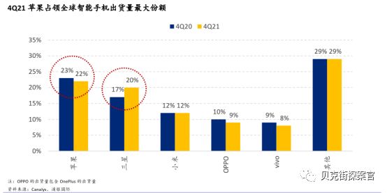 如果说今年1月份,手机出货量总体下降是因为疫情影响,那么以同样受疫情影响的2021年四季度出货数据来看,top5中苹果产品销量甚至有所下降,三星手机销量增速明显提升,国产品牌中,小米出货量持平,OPPO、vivo等均有所下降。