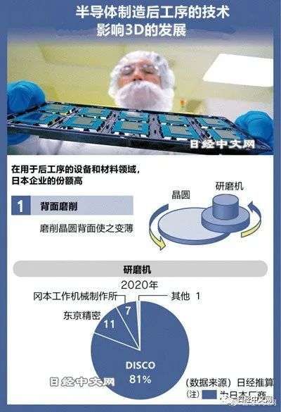 “(随着3D化取得进展)也能向没有交易的前工序企业提供附加值高的设备”,日本半导体设备厂商DISCO(迪思科)的社长关家一马这样说。在将半导体背面磨薄的“研磨机”领域,DISCO掌握8成份额,东京精密掌握逾1成全球份额。