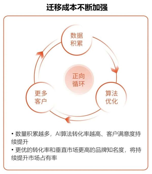 出色的算法技术基础,以及海量的数据积累,完全可以成为一家AI客服服务商的壁垒所在。一方面,最优的算法、最丰富的数据,可以打磨客服机器人的会话能力和转化能力,更高的转化能力必然获得更多的企业客户,更多的客户也将进一步完善其数据积累,并进一步反哺算法研发,并最终形成良性循环。在这一过程中,头部的AI客服服务商将进一步巩固自身优势,行业资源也将继续向头部企业集中。