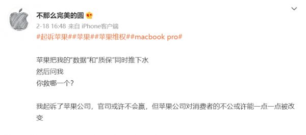思绪再三,微博用户@不那么完美的圆 决定起诉苹果,并且将在微博上更新后续的进展。此举迅速引起了科技圈的关注,作为数码爱好者的小雷自然也不例外,说实话,虽然最后的结果可能还是“胳膊拗不过大腿”,但是小雷依然为这位用户的勇气喝彩。
