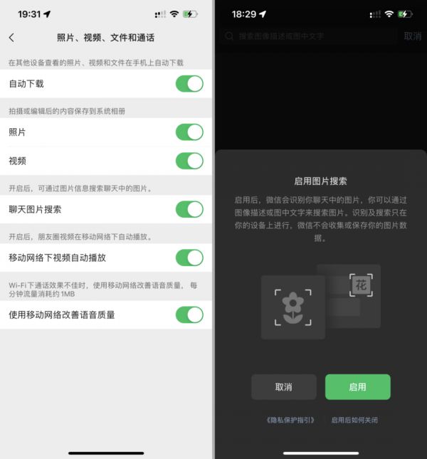 要打开这个功能,只需要在 设置 > 通用 > 照片、视频、文件和通话 里,打开「聊天图片搜索」的选项即可。