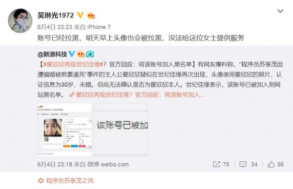 中新经纬客户端6月8日电(魏薇)近日,有网友爆料称,“程序员苏享茂被逼死”事件的女主人公翟欣欣疑似再次现身世纪佳缘。6月4日深夜11点,百合佳缘CEO吴琳光在微博迅速回应称,账号已经拉黑,明天早上头像也会被拉黑,没法给这位女士提供服务。
