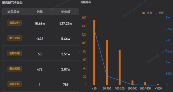直播货品方面,截至2月20日,东方甄选共计售出2.5万件单价小于50元的商品;4000余件单价50至100元区间的商品;2100余件单价100至300元区间的商品;而价格超过300元的商品销量约在160件。此外,占据销售额前三的商品品类依次为食品饮料、图书文娱和医药保健。