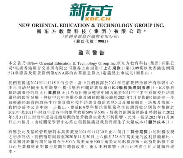 1月21日,新东方公告,预期集团截至2021年11月30日止6个月,录得8亿美元至9亿美元的亏损净额,主要由于业务终止对报告期间的总营收产生重大不利影响。