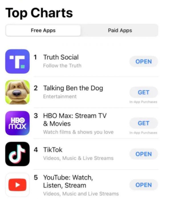 从网友发布的图片可以看到,在开放下载后不久,注册人数就超过10万人。一夜过后,周一早上,该app超越了HBO Max、TikTok、YouTube、Instagram 和 Facebook,荣登苹果商店app下载量的Top 1。但是Truth social在发布之日就遭遇了不顺,一些用户无法注册,还有一些用户收到了错误信息。但对于预订了这款应用的其他人来说,它会自动下载到他们的苹果设备上。