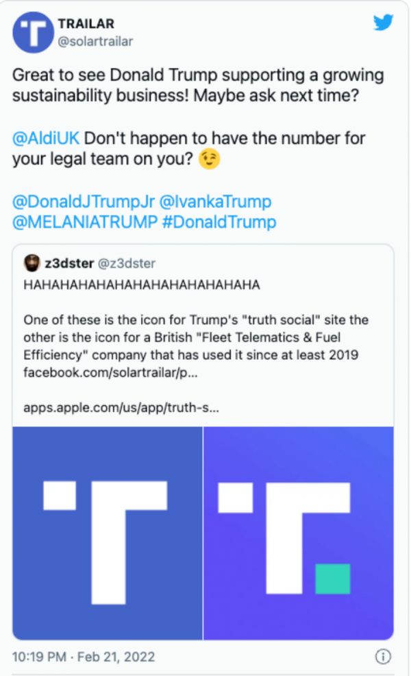 这款应用的标志也引起了英国小型可持续交通公司Trailar的注意,该公司正在调查Truth Social的品牌和自己的品牌之间的相似性。