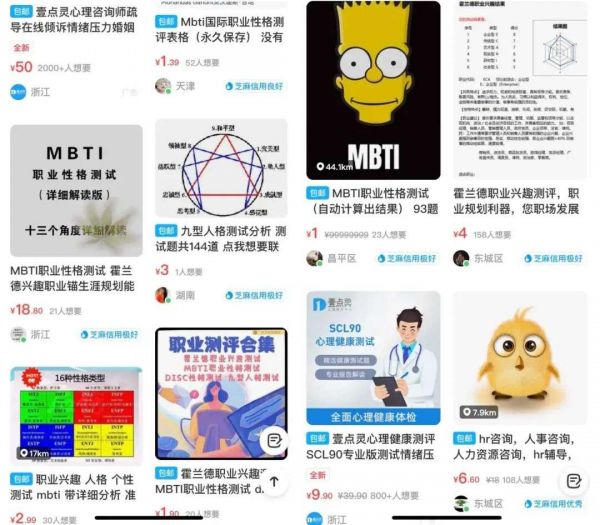 专业机构多在淘宝上开店,闲鱼则是大多个人从业者的聚集地。闲鱼卖家罗言的主业是心理咨询师,她从今年1月底开始接线上的测试和咨询。罗言的闲鱼中,除了MBTI,还有SCL90等心理测试,以及“房树人”这种需要人工解析的测试。