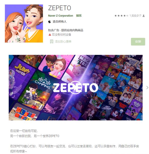 “在这里一切皆有可能”是ZEPETO在应用商店的简介。图片来源:Google Play