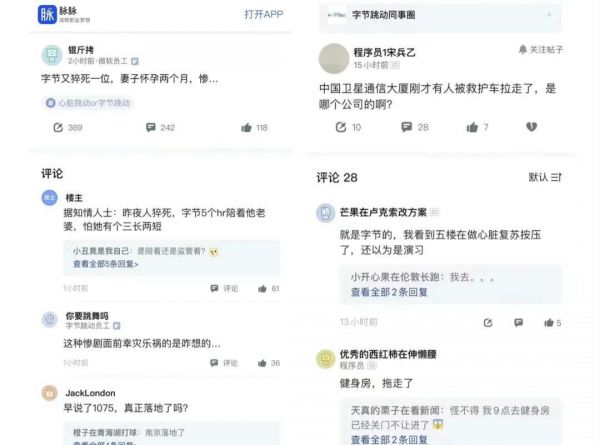 2月22日深夜,脉脉上“字节跳动同事圈”板块,一则“字节 (字节跳动) 又猝死一位,妻子怀孕两个月,惨...”的消息被广泛传开。据知情人士,事情发生后,字节跳动5个hr陪着猝死员工妻子,怕她有个三长两短。
