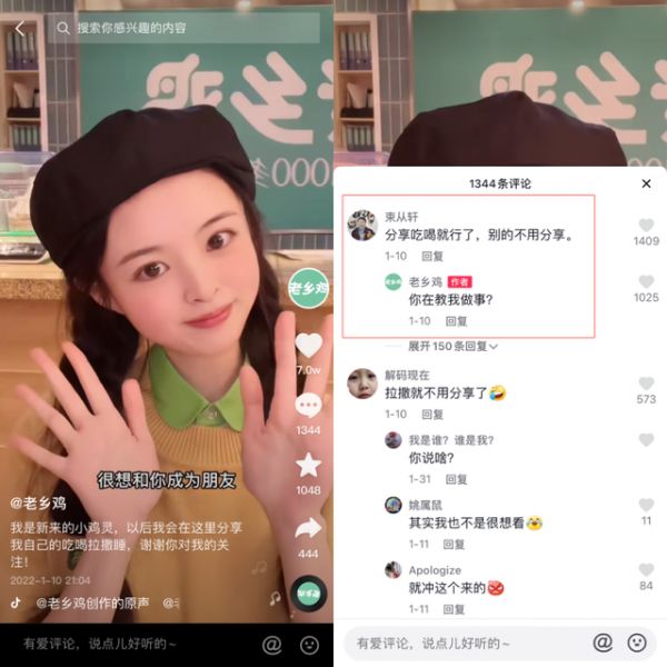 抖音官方账号主播自称“小鸡灵”,以老乡鸡服务员的形象出现,走颜值主播路线,生起气来连董事长都怼。